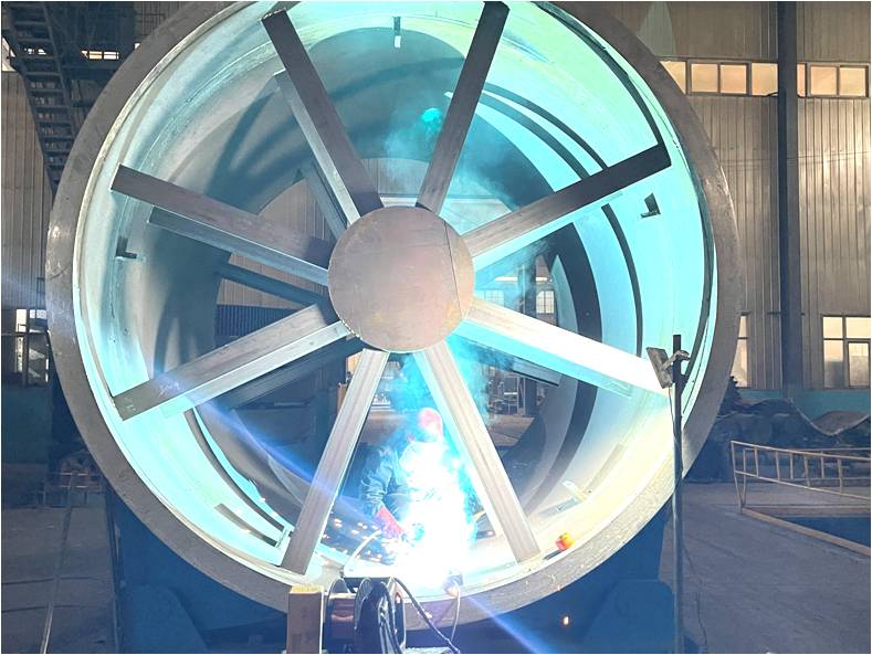 重點項目φ3.2×24m干燥機在重型成套廠鉚焊車間全速推進,生產(chǎn)現(xiàn)場火光四濺,生產(chǎn)氣氛一片火熱